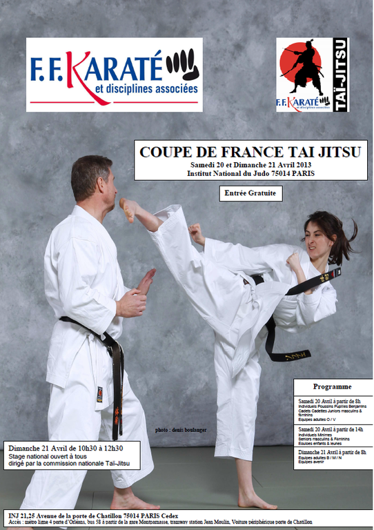 Le samedi 20 avril et dimanche 21 la Coupe de France de Taï-Jitsu se déroulera à Paris, au sein de l'Institut National de Judo.