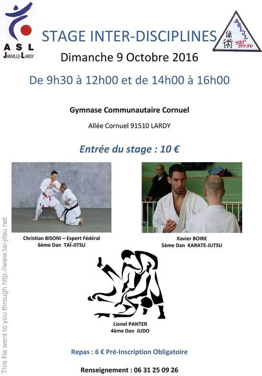 Nous organisons un Stage Inter-Discipline Taï-Jitsu, Karaté Jutsu et Judo le Dimanche 9 octobre 2016, qui se déroulera au Gymnase René Grenault - Rue Panserot - 91510 LARDY