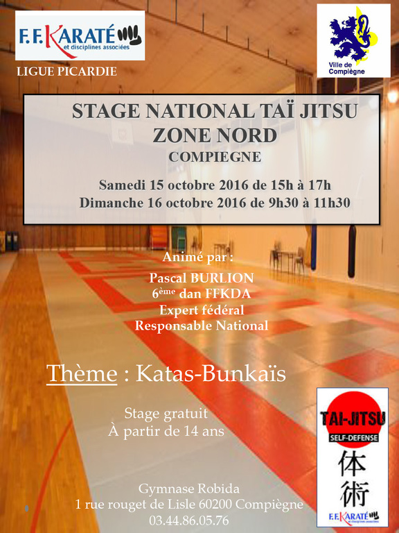 La Commission Nationaler organise une Stage Nationale Zone Nord le Samedi 15 et Domanche 16 octobre à Compiègne au Gymnase Robida - 1 rue Rougetr de Lisle 60200 COMPIÈGNE dirigé par Pascal BURLION Expert Fédéral et Responsable National Taï-Jitsu