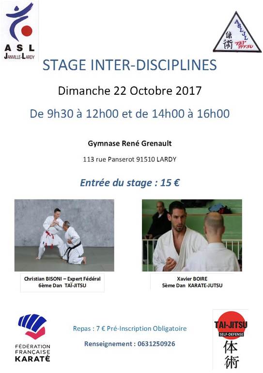 Nous organisons un Stage Inter-Discipline Taï-Jitsu / Karaté Jutsu le Dimanche 22 octobre 2017, qui se déroulera au Gymnase René Grenault - Rue Panserot - 91510 LARDY
