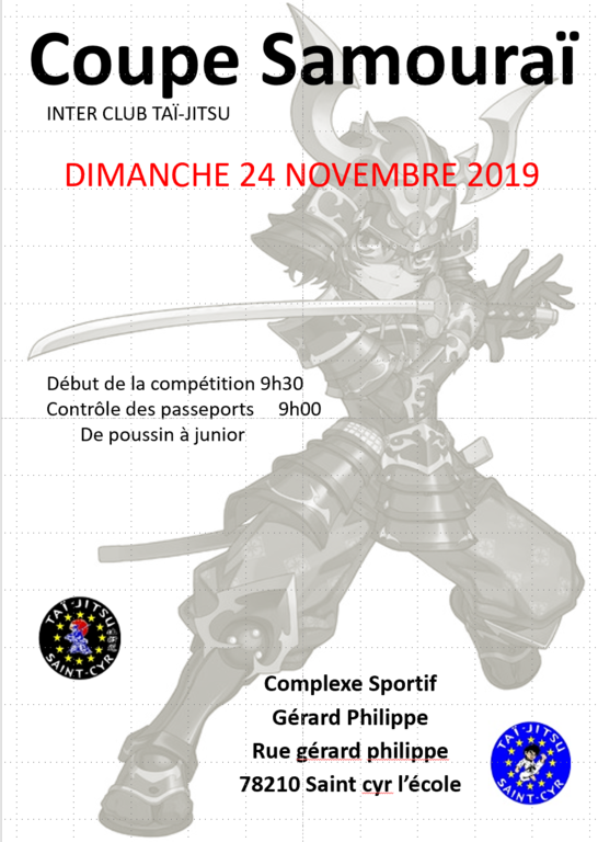 L'ASLJL Taï-Jitsu et le club de de Taï-Jitsu de Saint-Cyr oragnisent une grande rencontre inter-club le dimanche 24 novembre 2019 à Saint-Cyr. Du sport, de la compétition et surtout beaucoup d'amitié :)