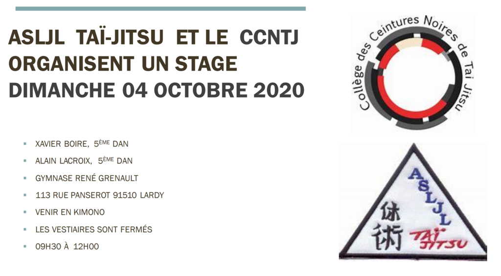 L'ASLJL TAÏ-JITSU ET LE CCNTJ (Collège des Ceintures Noires de Taï-Jitsu) ORGANISENT UN STAGE DIMANCHE 04 OCTOBRE 2020 A LARDY de 09H30 à 12H. Il sera animé par Xavier BOIRE (5ème DAN) et Alain LACROIX (5ème DAN). Note : venir directement en kimono (vestiaires fermés en raison des mesures sanitaires).